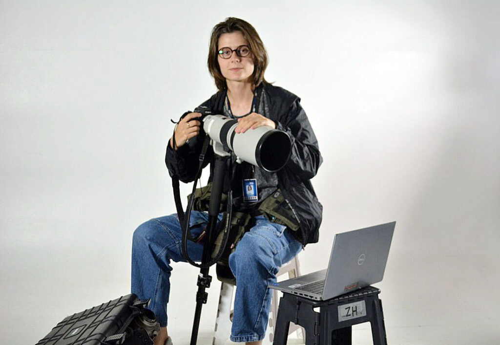 Quando fala sobre o seu trabalho em campo, Duda descreve a mochila que parece mais pesada que o próprio corpo: câmeras, lentes, monopé, computador, capa de chuva, panos de limpeza, banquinho. “Fotografar esporte é uma loucura”, ela diz, rindo. “A gente carrega muita coisa. As lentes são pesadas, o corpo dói. Mas eu acho que é isso que faz parte do meu trabalho, estar pronta para tudo.”