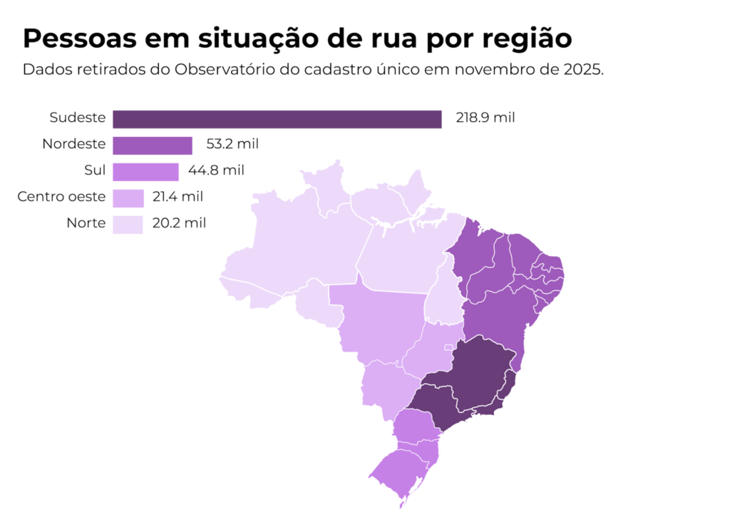 Em novembro de 2025, conforme dados do Observatório do Cadastro Único, o Brasil tinha 358,5 mil pessoas em situação de rua registradas, o equivalente a um em cada 595 habitantes. A concentração é desigual: a Região Sudeste reúne 61% do total, com destaque para o estado de São Paulo, que, sozinho, contabiliza 148.730 pessoas (41,5%). Entre os dez municípios com maior número absoluto de pessoas em situação de rua estão: São Paulo, Rio de Janeiro, Belo Horizonte, Brasília, Salvador, Fortaleza, Curitiba, Porto Alegre, Campinas e Florianópolis, com quase 48% de toda a população em situação de rua contabilizada. No recorte do Rio Grande do Sul, são 15.906 pessoas nessa condição, sendo 6.420 apenas em Porto Alegre, que figura entre as capitais com maior concentração.
