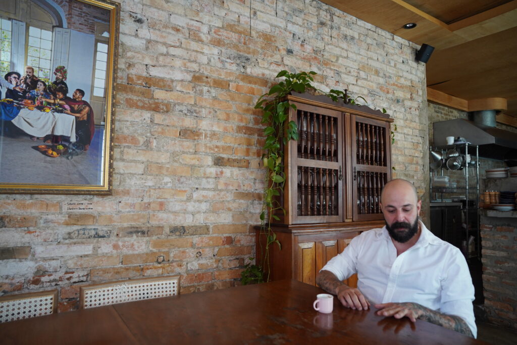 O relógio batia quase meio-dia em Porto Alegre. O ar-condicionado ligado buscava refrigerar o espaço. Estávamos sentados na maior mesa do salão principal do restaurante, a única com seis cadeiras, o restante das outras sete mesas tinham quatro. Segundo o chef, ele gosta que os clientes venham de “galera”, por isso a ausência de mesas pequenas com apenas duas cadeiras. Atrás da grande mesa, há um quadro pendurado na parede de tijolos aparentes fazendo alusão à Santa Ceia, de Leonardo da Vinci. Para Mauri, ele é muito especial e representa o início do restaurante, já que foi feito por uma amiga artista em 2023, antes da inauguração.
